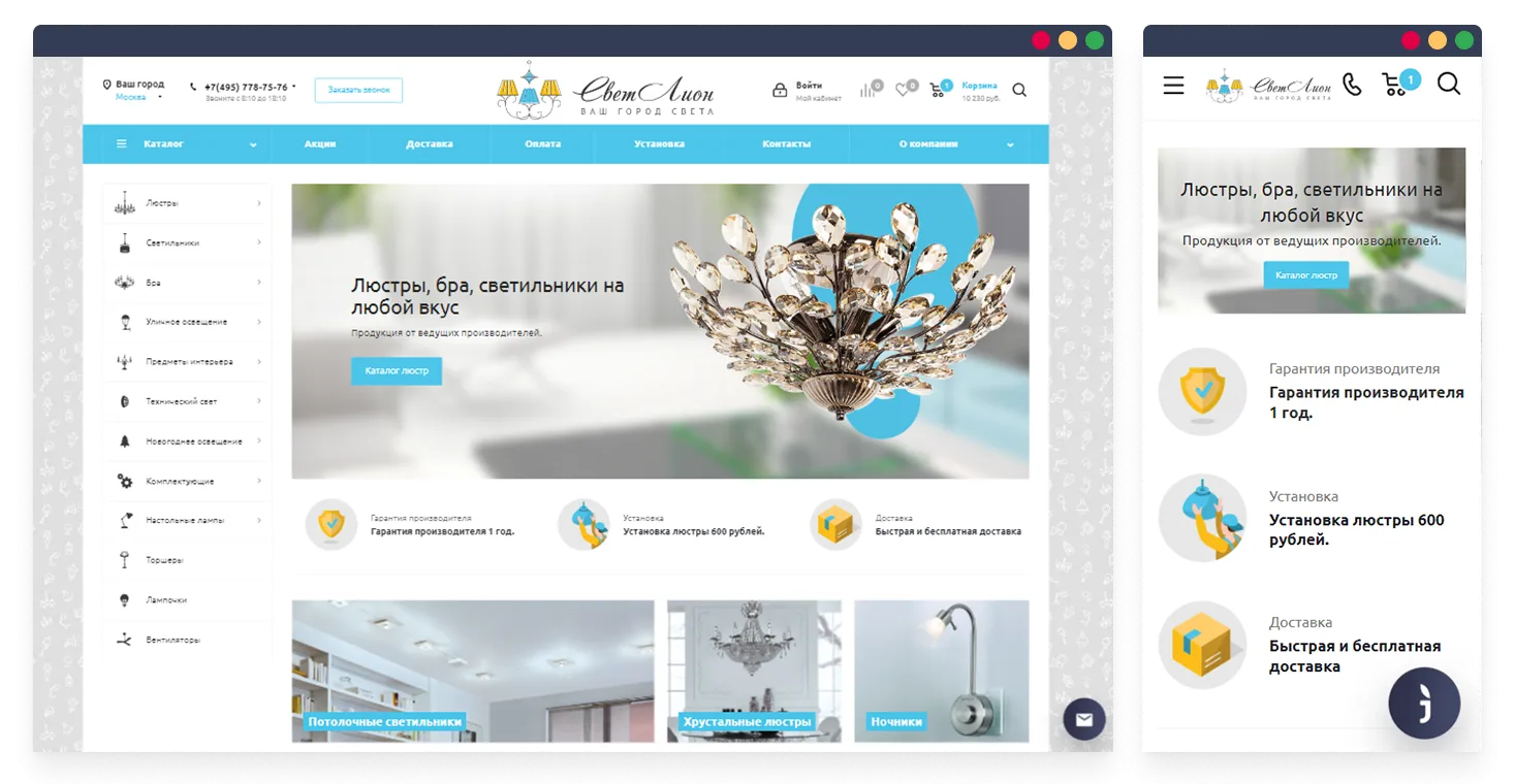 «СветЛион» — интернет-магазин осветительного оборудования. На сайте представлено более 50 000 наименований продукции от более 80 брендов. В каталоге товаров можно найти люстры, светильники, прожекторы, настольные лампы, зеркала с подсветкой и многое другое. Продажа осуществляется не только по Москве, но и в другие регионы. Сайт ориентирован на частных лиц, дизайнеров и строительные компании.